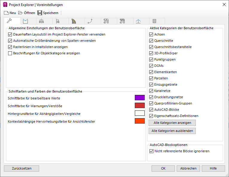Voreinstellungen bestimmen alle Aspekte der Benutzeroberfläche von Project Explorer, die für die Erstellung von Berichten nicht relevant ist. Beispiele: Farbschemata und Vorgabe-Maßstabseinstellungen für Höhen- und Querprofilpläne, Schriftarteinstellungen für die Benutzeroberfläche sowie Sichtbarkeit und Bereichslayout der einzelnen Objektkategorie-Registerkarten im Project Explorer-Fenster.