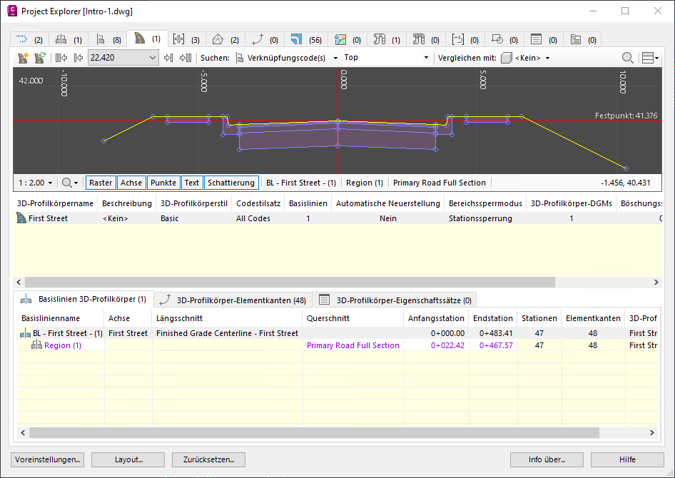 Optional können Sie das Achs-/Längsschnitt-Stationsintervall (Verkettung) für alle Objekttypen auf einen gemeinsamen Wert festlegen und sperren.