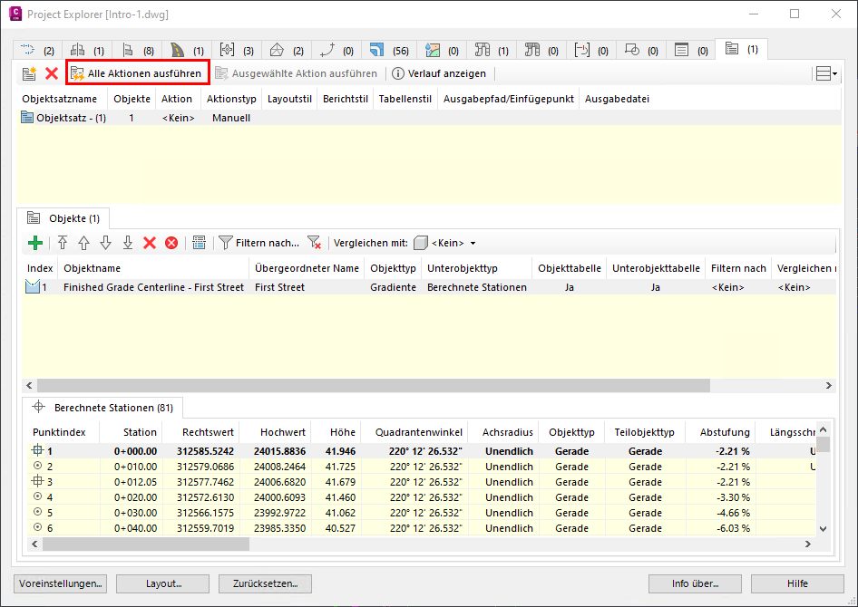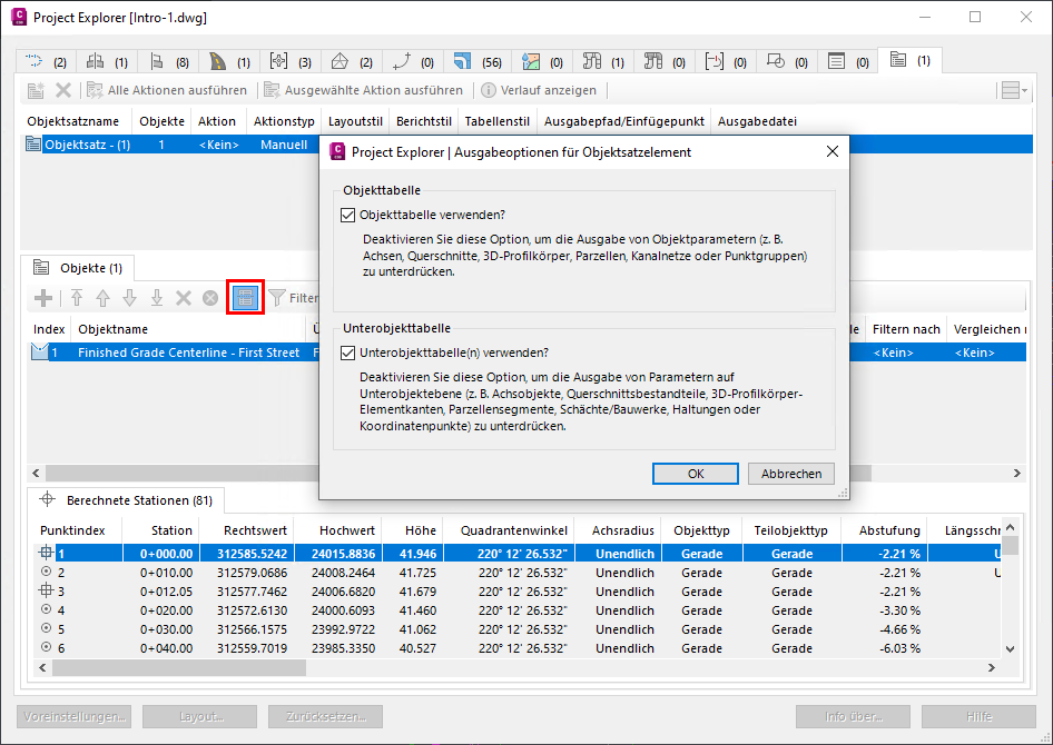 Ein Objektsatz ist eine vom Benutzer definierbare Liste von Civil 3D-Objekten, der Sie eine Aktion und andere zugehörige Details zuweisen können. Aktionen können manuell oder in einigen Fällen dynamisch ausgelöst werden, wenn der Project Explorer feststellt, dass eine abhängige Komponente in Ihrem Entwurf geändert wurde. Objektsätze dienen in der Regel zur Automatisierung der Erstellung vorkonfigurierter Berichte, Tabellen, AutoCAD-Zeichnungen oder AutoCAD-Tabellen. Die genau erforderliche Kombination von Stilen, Filtern und Ausgabeanweisungen hängt vom Aktionstyp und Objekt ab, die zugewiesen werden.
