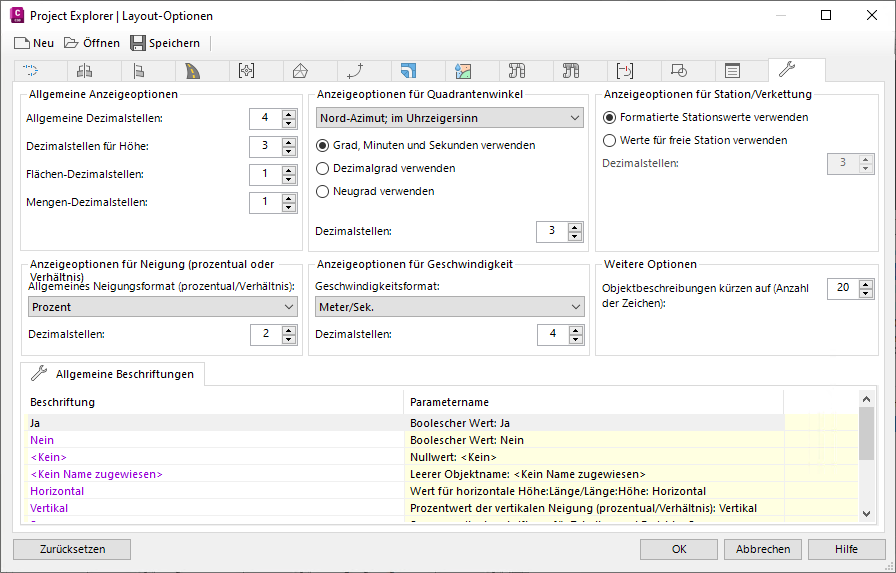 Project Explorer bestimmt, und zwar in der Benutzeroberfläche und in generierten Berichten, Tabellenkalkulationen und AutoCAD-Tabellen.