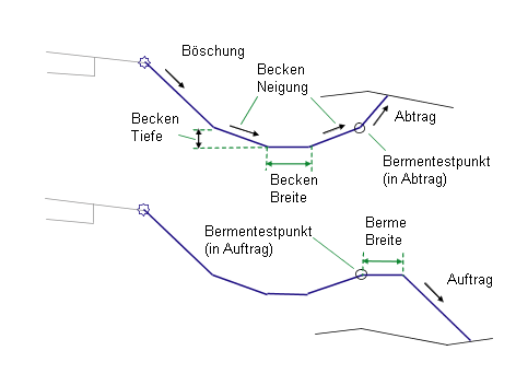 Dieser Querschnittsbestandteil fügt Verknüpfungen ein, um ein Becken und einen Einschnittböschungsfuß für eine Abtragssituation zu erstellen, bzw. ein Becken, eine Berme und eine Dammböschung für eine Auftragssituation.