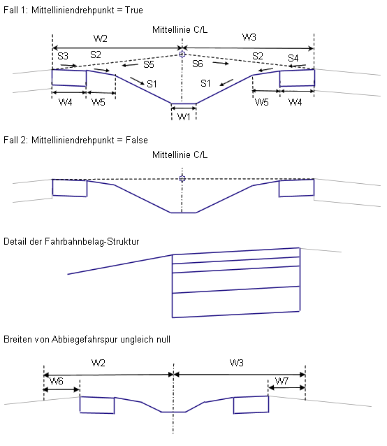 Der Mittelstreifen kann so konfiguriert werden, dass sich der Querneigungsdrehpunkt auf der Mittellinie oder an den Innenrändern der Fahrspuren befindet. Wird Mittellinie Drehpunkt verwendet, werden die Überhöhungsneigungen der linken und rechten Außenfahrspur aus den Querneigungsangaben der Basislinie ermittelt und die Höhen der Fahrspurinnenränder werden durch Anwendung dieser Neigungen auf die linken und rechten Mittelstreifenbreiten vom Zuordnungspunkt aus berechnet. Wird Mittellinie Drehpunkt nicht verwendet, werden die Fahrspurränder auf der Höhe des Zuordnungspunkts gehalten.
