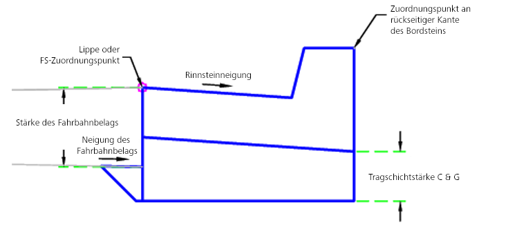 | Zuordnungspunkt | Zuordnungspunkt des Bordsteins oder Bord- und Rinnsteins | Lippe oder FS / hintere Bordsteinkante | Lippe oder FS |