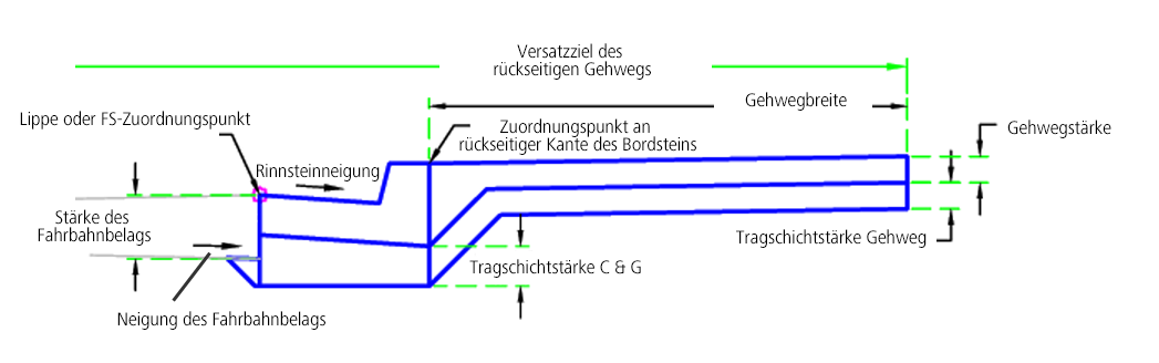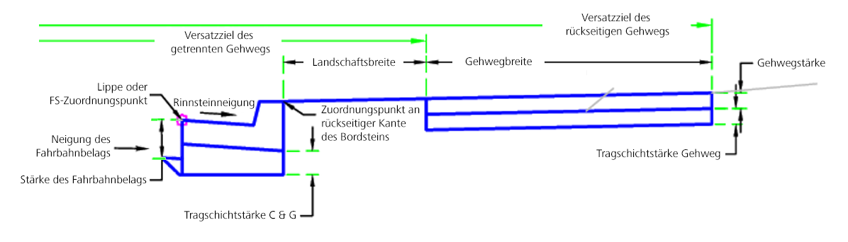 | Rückseitiger Gehweg Versatz | Kann zum Überschreiben der festen Gehwegbreite und zum Binden des Gehwegaußenrands an eine Achsparallele verwendet werden. Folgende Objekttypen können beim Festlegen der Breite als Ziele verwendet werden: Achsen, Polylinien, Elementkanten oder Vermessungslinienzüge. | Optional |