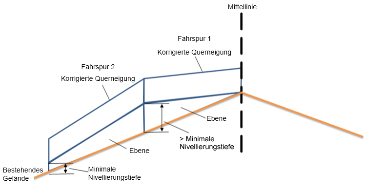 Die korrigierte Querneigung wird berechnet und angewendet, es wird jedoch keine Höhenanpassung oder Flattern angewendet. In einigen Fällen wird evtl. die minimale Nivellierungstiefe nicht erreicht.