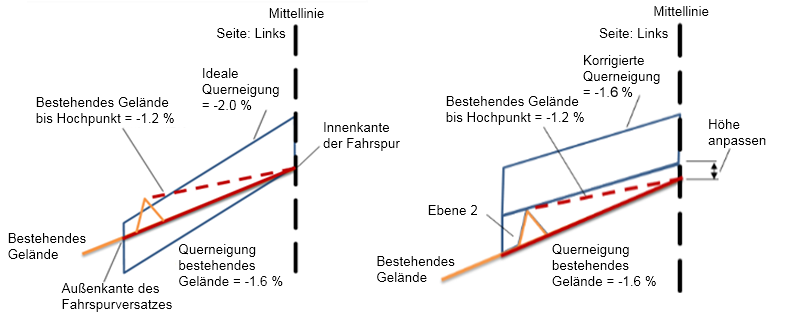 Fall 1-2: Ideale Querneigung ist größer als die bestehende Geländequerneigung