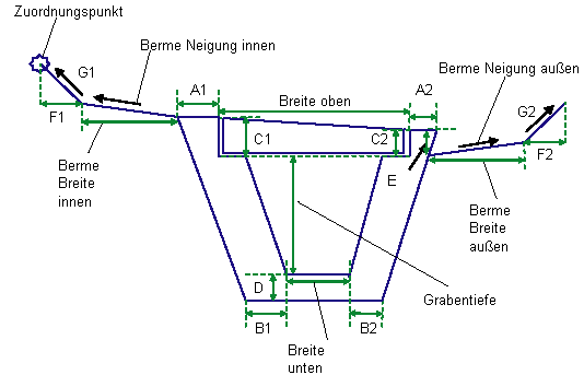 | G1 | Neigung der (optionalen) Böschungsverknüpfung (steigend) innen. Sie wird ab der Grabenstruktur gemessen. Eine positive Neigung deutet auf eine steigende Verknüpfung vom Anfangspunkt aus hin. | Numerisch, Neigungstyp | 1:1 |