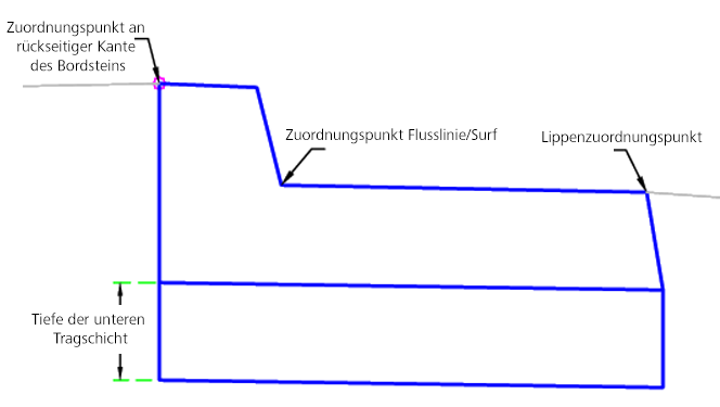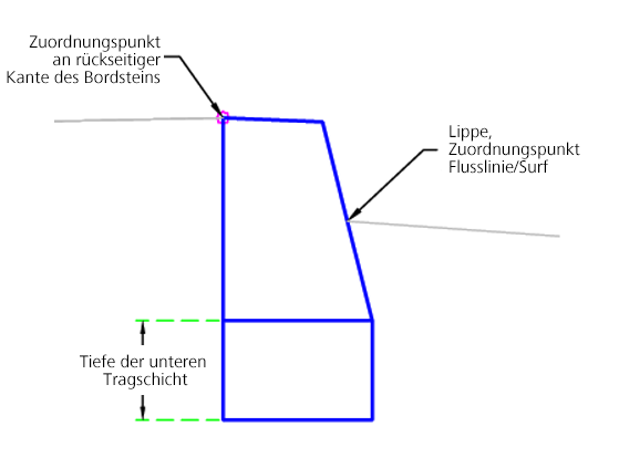 Die Bord- und Rinnsteinverknüpfungen werden basierend auf den im Querschnittsbestandteil gespeicherten Werten eingefügt. Alle Bemaßungen sind positiv und ungleich Null. Wird eine untere Tragschichttiefe ungleich null angegeben, wird die untere Tragschicht nicht eingefügt. Die untere Tragschicht schließt zur rückseitigen Unterkante des Bordsteins ab.