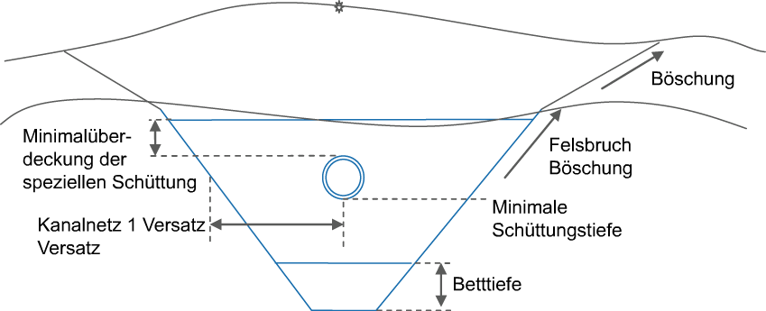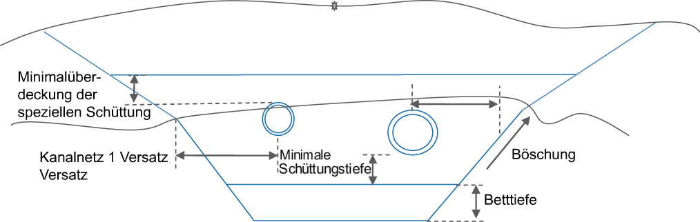 In beiden Fällen bestimmt der Querschnittsbestandteil den unteren Rand der Grabentiefe und die Grabenbreite basierend auf der Position einer Haltung bzw. der Haltungen in angegebenen Kanalnetzen. Die Minimalüberdeckung der speziellen Schüttung wird durch den Außendurchmesser oben der höchsten Haltung am Querprofil ermittelt. Die Tiefe (min.) der speziellen Schüttung wird durch den Außendurchmesser unten an der untersten Haltung der berücksichtigten Station ermittelt. Es spielt keine Rolle, zu welchem DGM die Böschung gehört, es wird die entsprechende Neigung - Verhältnis (Felsbruch oder Regulär) verwendet.