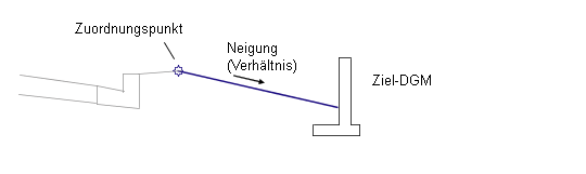 Es wird eine Verknüpfung vom Zuordnungspunkt nach links oder rechts mit der angegebenen Neigung verlängert, bis diese das Ziel-DGM schneidet.