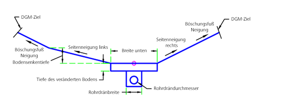 Beginnend am Zuordnungspunkt wird die Bodensenke mithilfe der Eingabeparameter erstellt. Wenn das Ziel-DGM festgelegt ist, wird das Böschungsfuß-DGM gefunden (nur bei Abtrag). Wenn Rohrdrän einschließen auf Ja festgelegt ist, wird der Rohrdrän erstellt.
