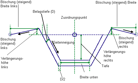 | Böschung (steigend) Höhe links | Kann verwendet werden, um die feste rechte Böschung zu überschreiben und an einen Längsschnitt zu binden Folgende Objekttypen können hierfür als Ziele verwendet werden: Längsschnitte, 3D-Polylinien, Elementkanten oder Vermessungslinienzüge. | Optional |