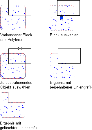 Sie können einen Teil einer Liniengrafik oder eines Blocks, der Liniengrafiken enthält, subtrahieren, ohne die übrigen Komponenten neu zeichnen zu müssen. Der zu subtrahierende Teil kann Linien, Polylinien (offene oder geschlossene), Bogen, Kreise, Text oder Schraffuren enthalten bzw. dadurch begrenzt werden. Wenn bei der Subtraktion ein Teil einer geschlossenen Polylinie entfernt wird, wird die Polylinie als geschlossen neu erstellt. Wenn die Subtraktion eine geschlossene Polylinie halbiert, werden beide Teile als geschlossene Polylinie neu erstellt. Wenn jedoch eine Schraffur halbiert wird, bleibt diese ein einzelnes Liniengrafikobjekt, das Sie auswählen können, indem Sie auf einen der Teile klicken.