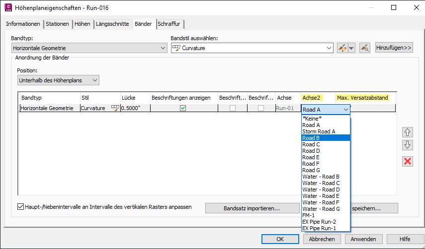 - Die Eigenschaft Max. Versatzabstand wurde als Bereich hinzugefügt, um die Anzeige der sekundären Achse im Überhöhungsband zu beschränken.