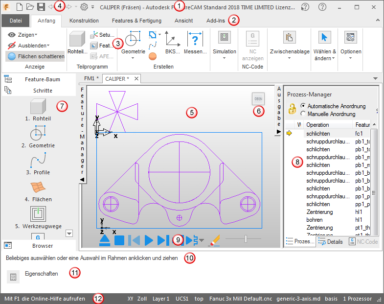 Die Titelleiste zeigt den Namen der Bauteildatei, in diesem Fall CALIPER.fm, und den Typ des Bauteilsetups in runden Klammern an, in diesem Fall (Fräsen). Wenn Ihre Bauteil-Datei nicht gespeicherte Änderungen enthält, wird ein Sternchen (*) neben dem Namen angezeigt.