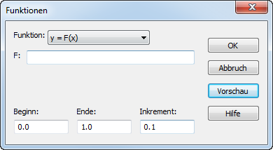 Wählen Sie die Art der Funktion, die Sie erstellen wollen, in der Funktionsliste aus. Benutzen Sie y = F(x), um y als eine Funktion von x und x = F(y) um x als eine Funktion von y zu spezifizieren.