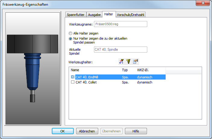 Verwenden Sie die Registerkarte Halter im Dialogfeld Fräsen-Werkzeug-Eigenschaften, um den Werkzeughalter für das ausgewählte Werkzeug zu ändern oder zu bearbeiten.