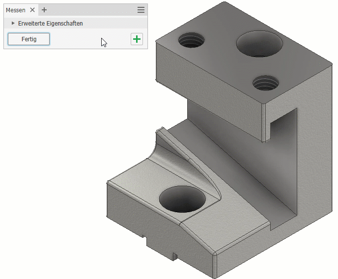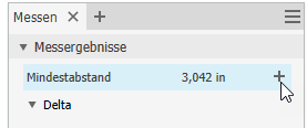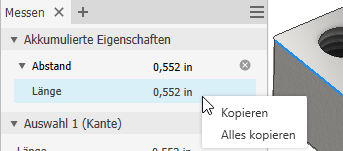 - So fügen Sie eine lineare, Flächen-, Volumen-, Massen- und/oder Winkelmessung zum Bereich Akkumulierte Eigenschaften hinzu: Treffen Sie im Grafikfenster eine Auswahl, und klicken Sie dann auf das Pluszeichen neben dem Messtyp. Wählen Sie beispielsweise eine Linie im Grafikfenster aus, und klicken Sie dann auf das Pluszeichen neben der Messung. Der Wert wird zur Messungsgruppe Abstand unter Akkumulierte Eigenschaften hinzugefügt.