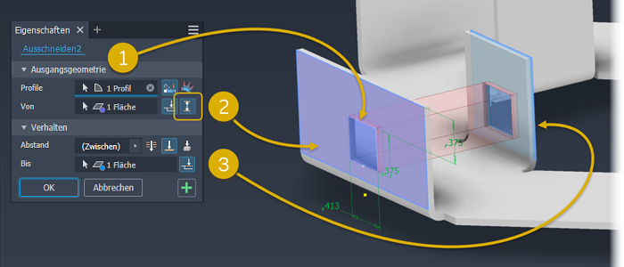 Anmerkung: Wenn die Von-Fläche nicht direkt mit dem Ausklinkungsprofil übereinstimmt, wird die Option Flächendehnung bis Startelement aktiviert.