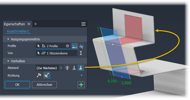 Durch alle: Extrudiert das Ausklinkungsprofil in der angegebenen Richtung durch alle Elemente und Skizzen.