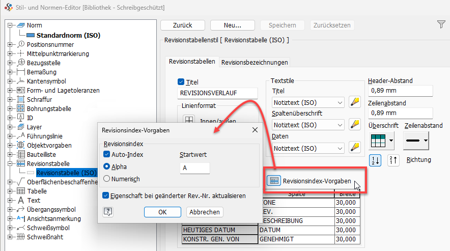 Es ist jetzt möglich, eine Vorgabenummerierung (alphabetisch oder numerisch) aus einer Zeichnungsvorlage anstatt über die Revisionstabelle selbst zu erstellen. Dem Stil- und Normen-Editor wurde die neue Option Revisionsindex-Vorgaben für Revisionstabellen hinzugefügt.
