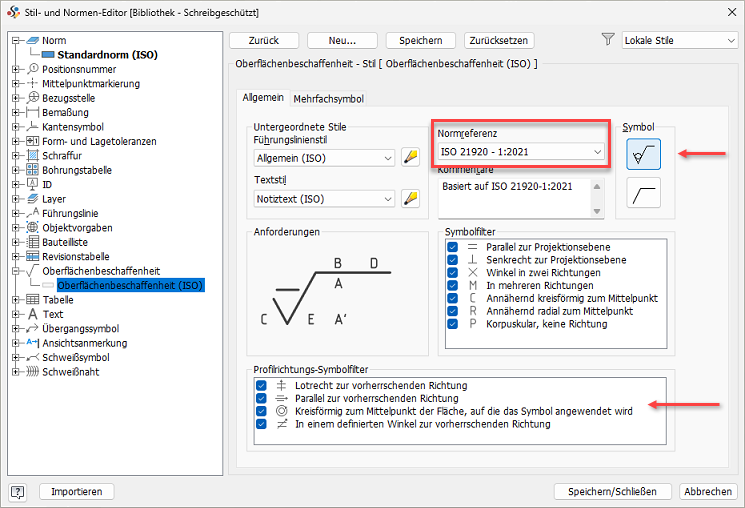 Sie können nun Symbole für die Oberflächenbeschaffenheit basierend auf der Norm ISO 21920-1 definieren.