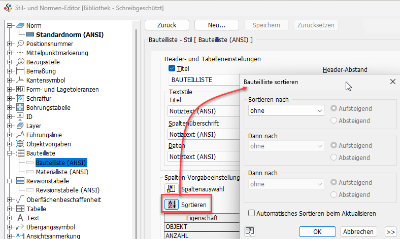 Sie können jetzt die Sortierreihenfolge von Elementen in der Stückliste für Bauteillisten direkt im Stil-Editor mithilfe der neuen Option Sortieren festlegen.