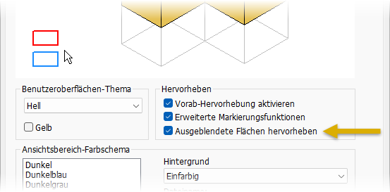 Gruppe Hervorheben und wählen Ausgeblendete Flächen hervorheben aus. Diese Option ist nur verfügbar, wenn die erweiterte Markierungsfunktion aktiviert ist.