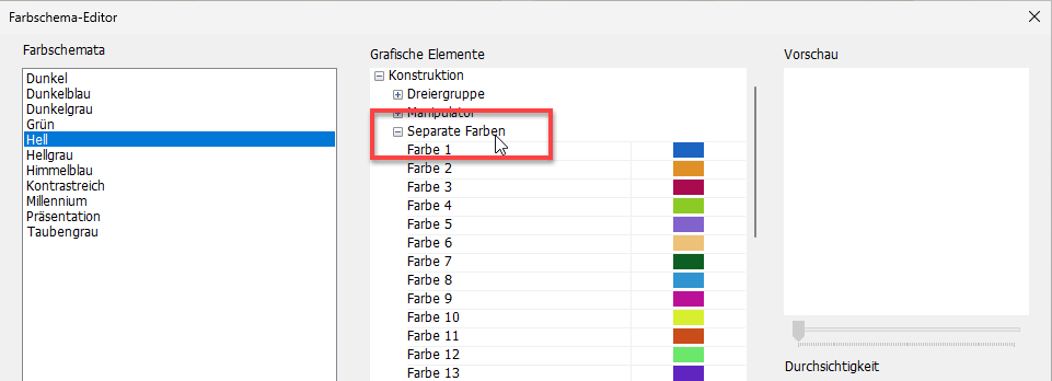 Die Farbliste im Farbschema-Editor kann jetzt angepasst werden. Optionen wurden dem neu erstellten Abschnitt Separate Farben hinzugefügt.