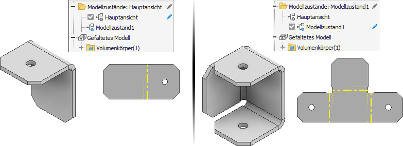 Blechbauteile profitieren ebenfalls von Modellzuständen. Mithilfe des Modellzustands können Sie nun Konfigurationen mit eindeutigen gefalteten Elementen und Abwicklungen erstellen.