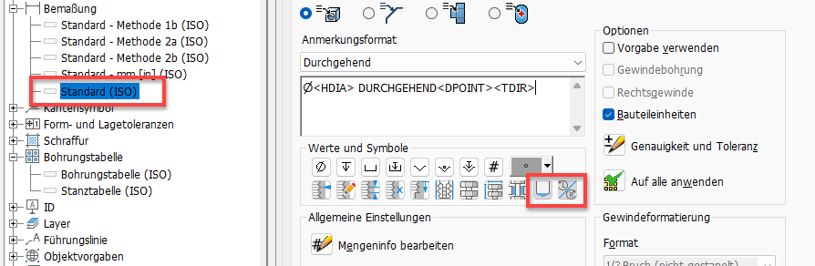 Weitere Informationen finden Sie unter So erstellen Sie Bohrungen, Bohrungsinfo bearbeiten - Referenz und Stil- und Normen-Editor: Bemaßungsreferenz.