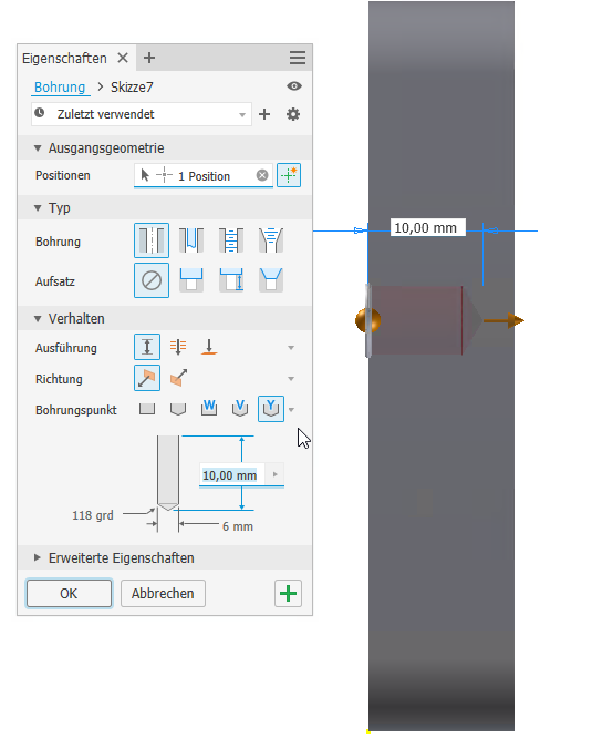 Sie können jetzt für Bauteile und Baugruppen drei neue Bohrpunkttypen (Flach W, Winkel V, Winkel Y) verwenden, wenn Sie Bohrungen erstellen. Der Typ Winkel Y erstellt einen Bohrungspunkt, der in den Bohrungstiefenparameter integriert wird. Der Typ Flach W führt zur Erstellung eines flachen Bohrungspunkts.