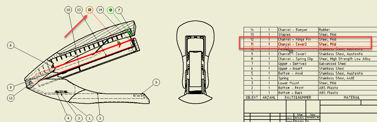 Wenn Sie eine oder mehrere Zeilen in der Bauteilliste auswählen, werden die entsprechenden Positionsnummern hervorgehoben. Die übergreifende Hervorhebung von Positionsnummern hilft Ihnen dabei, die Positionsnummern zu finden, die der ausgewählten Zeile in der Bauteilliste entsprechen. Dies erleichtert die Suche nach Bauteilgeometrie mit Positionsnummern.