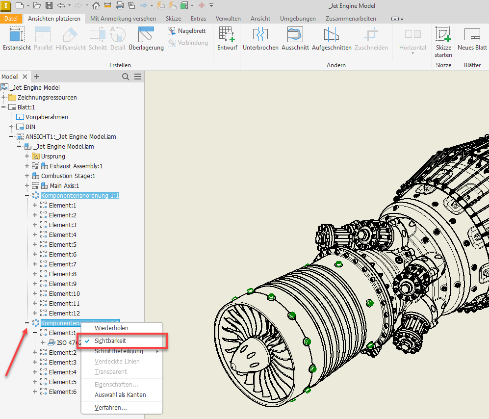 Es ist nun möglich, die Komponentenanordnung im Zeichnungs-Browser auszuwählen. Wenn Sie eine Komponentenanordnung auswählen, werden (nur) der Browser-Eintrag für die Anordnung und alle Komponenten in den Grafiken hervorgehoben, aus denen die Anordnung (oder die Anordnung von Anordnungen) besteht. Darüber hinaus wurden die Optionen Sichtbarkeit und Kanten auswählen zum Kontextmenü hinzugefügt.