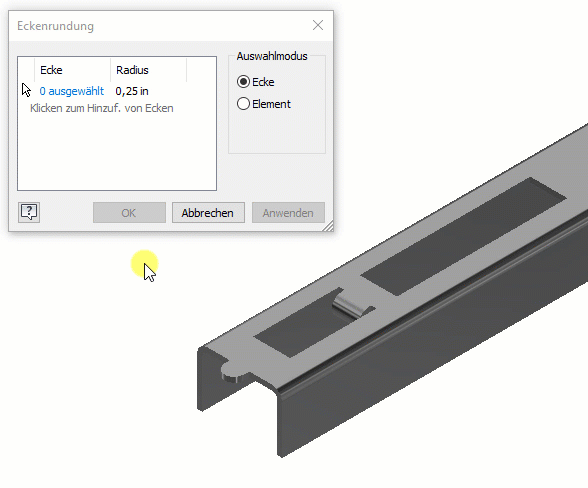 Bisher war es erforderlich, Eckkanten beim Runden und Fasen von Ecken mit den Befehlen Eckenrundung und Eckfase nacheinander auszuwählen. Jetzt können Sie die Fensterauswahlmethode verwenden, um die Kanten zum Runden und Fasen auszuwählen.