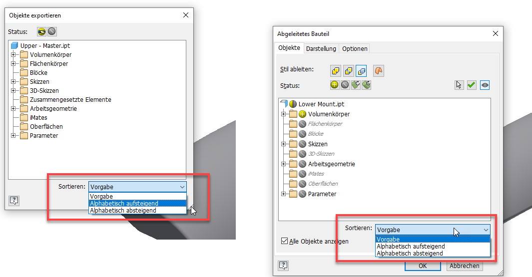 Verwenden Sie die neue Dropdown-Liste Sortieren, um die Reihenfolge der Strukturknoten einschließlich der Parameter anzugeben. Es wird zu den folgenden Dialogfeldern hinzugefügt: