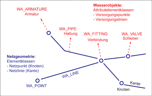 Wasserobjekte werden in den Attributobjektklassen WA_POINT.FID_ATTR (Versorgungspunkte) und WA_LINE.FID_ATTR (Versorgungsleitungen) gespeichert. Diese beziehen sich auf die entsprechende Punkt- oder Linien-Geometrieobjektklasse. |