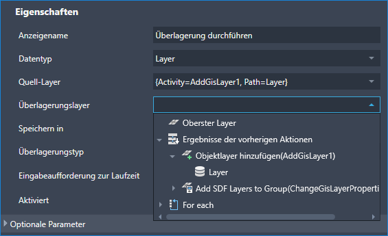 Um einen Layer zu verwenden, der in einer vorherigen Aktivität erstellt wurde, wählen Sie ihn in der Liste unter Ergebnisse der vorherigen Aktionen aus.
