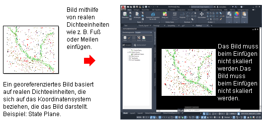 Die angegebene Auflösungseinheit richtet sich nach der Art des einzufügenden Bildes. Die folgenden zwei Beispiele erläutern den Unterschied zwischen dem Einfügen eines Bildes, das mit dpi gescannt wurde, und einer in SI-Einheiten gespeicherten Luftaufnahme/Satellitenfotografie.