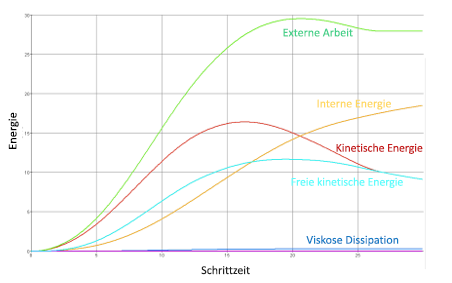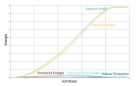 Einfach ausgedrückt: Interne Energie ist gleich externer Arbeit. Um eine annähernd quasi-statische Lösung im Explicit-Dynamikalgorithmus zu erhalten, soll die Größe der kinetischen Energie und der viskosen Dissipation in der Lösung im Vergleich zur Größe der internen Energie und der externen Arbeit verringert werden. Zu diesem Zweck wird die Dauer des Ereignisses so lang gewählt, dass die kinetische Energie ein kleiner Bruchteil der internen Energie ist. Dies ist in gewisser Weise subjektiv, und die Dauer wird mittels Versuch und Irrtum so gewählt, dass die kinetische Energie bei 1 bis 2 Prozent der internen Energie liegt. Erstaunlicherweise können quasi-statische Lösungen in sehr kurzer Zeit erreicht werden – viel schneller als man dies bei einer statischen Lösung normalerweise erwarten würde. In der Regel liegt die Dauer letztendlich im Millisekundenbereich.