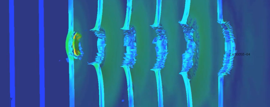 Eine der vielseitigsten Funktionen des Kontakterkennungs-Algorithmus besteht darin, dass die Flächen des Modells bei Materialerosion automatisch neu aufgebaut werden und neue Flächen aufgrund der Elementlöschung freigelegt werden. Abbildung 2 zeigt die Simulation eines Vogelschlags bei einer Turbine.