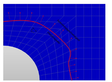 Mit Autodesk Explicit können Kriterien zum Löschen von Materialien definiert werden, die Materialausfälle und somit die Entfernung aus der Simulation steuern. Dazu definiert man einfach einen Höchstwert für verschiedene Dehnungsmaße, die das Material nicht übersteigen darf. Wenn die benutzerdefinierten Kriterien an einer finiten Position im Modell erfüllt sind, entfernt Autodesk Explicit das Material an dieser Position und löscht das entsprechende Element aus dem Netz. Typische Dehnungsmaße zum Löschen sind die äquivalente plastische Dehnung und die maximale Hauptdehnung.