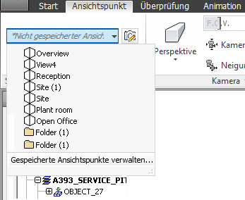 Klicken Sie auf Registerkarte Ansichtspunkt > Gruppe Speichern, laden und wiedergeben > Dropdown-Liste > Aktueller Ansichtspunkt, und wählen Sie den gespeicherten Ansichtspunkt aus der Liste.