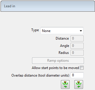 Ramp Options — Click to display the Ramp Options dialog, where you can specify how the tool ramps into the stock when using a Ramp-type move. This is available only when a Ramp move is selected as the Type of Lead in move.