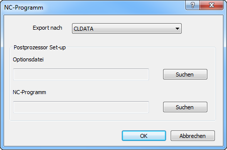 - CLDATA, um eine NC-Programmdatei anzulegen. Verwenden Sie die obere Suchen-Schaltfläche, um die PostProcessor-Optionsdatei auszuwählen, die für die verwendete Werkzeugmaschinen-Steuerung konfiguriert ist. Um den Namen der NC-Programmdatei einzugeben, verwenden Sie die untere Suchen-Schaltfläche.