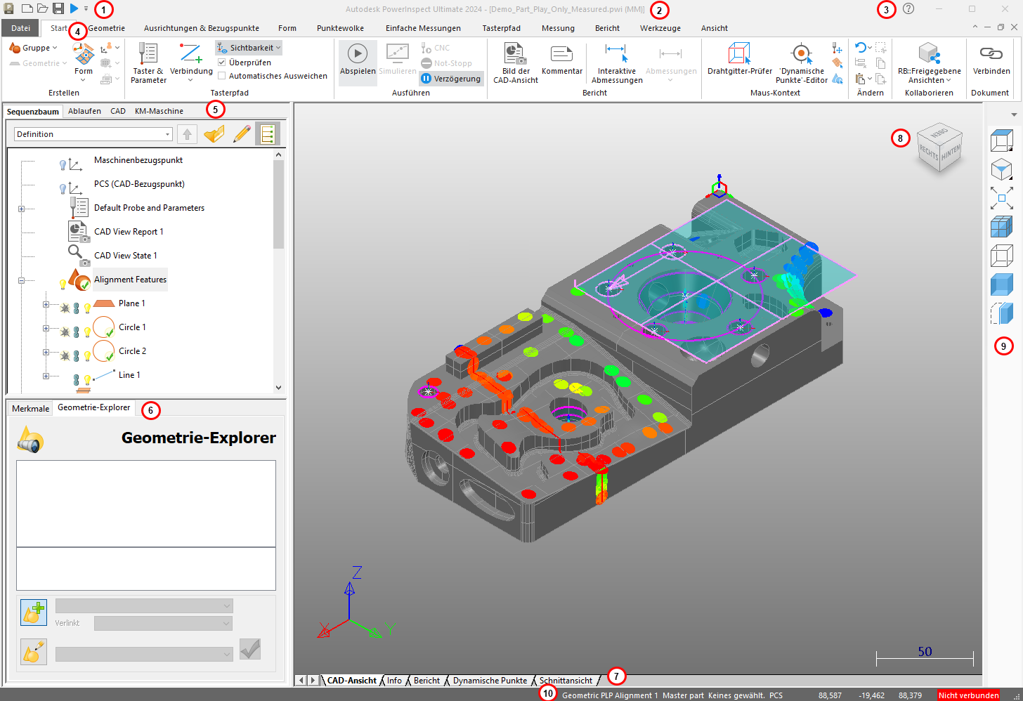 Grafikbereich-Registerkarten – Verwenden Sie den Grafikbereich, um das Modell und Ihre Messdaten anzuzeigen. Dieser verfügt über mehrere Registerkarten: