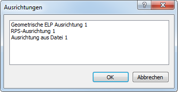 Um die aus einer Ausrichtung abgeleitete Transformationsmatrix zu laden, wählen Sie die Ausrichtung in der Liste aus, und klicken Sie auf OK. Sämtliche bestehende Transformationen werden gelöscht und die Matrix, die aus den Messungen der Ausrichtung abgeleitet wurde, wird angezeigt.