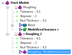 Um eine Kopie zu erstellen, klicken Sie auf die Rohteilmodell-Registerkarte > Aktiv > Duplizieren. PowerMill erstellt das neue Rohteilmodell Schruppen_1 mit einem einzigen Blockzustand, der das Rohteil aus dem aktiven Werkzeugwegstatus im primären Rohteilmodell darstellt.
