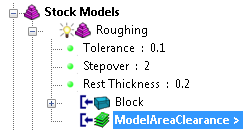 Beispiel: Das folgende Rohteilmodell Schruppen mit dem Werkzeugweg ModelAreaClearance als aktuell aktiver Werkzeugwegstatus.