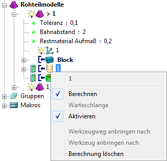 Klicken Sie mit der rechten Maustaste auf ein Rohteilmodell-Werkzeug, damit das Menü angezeigt wird.